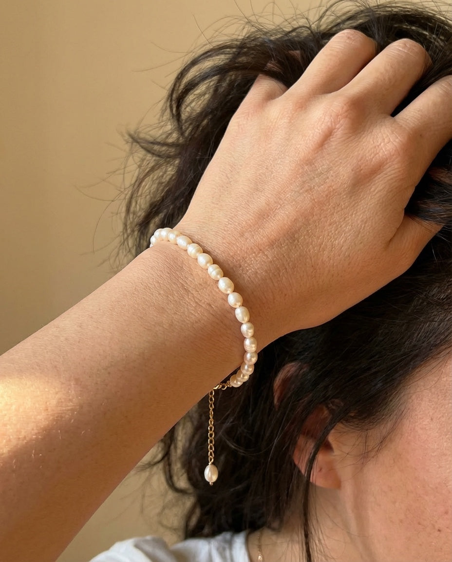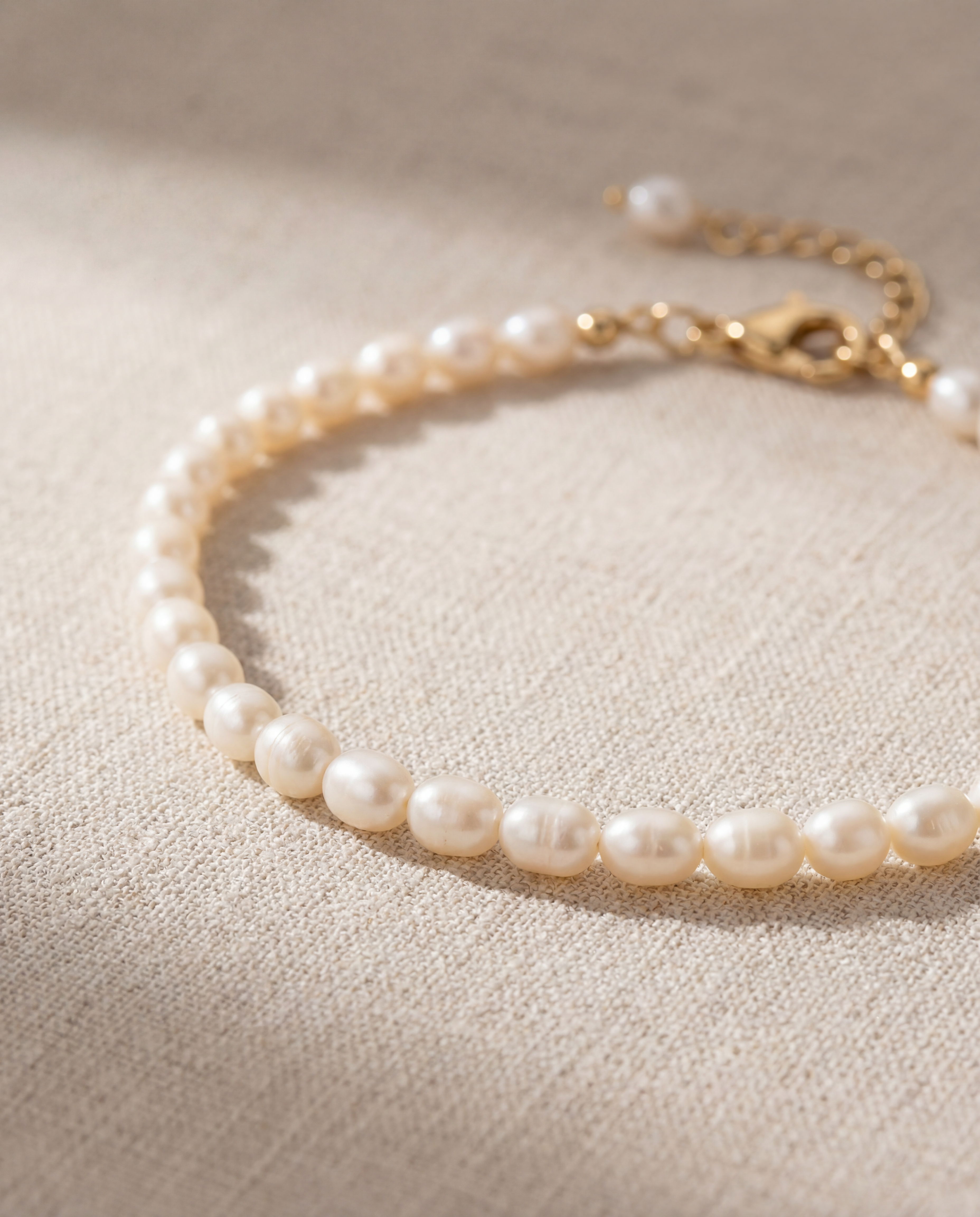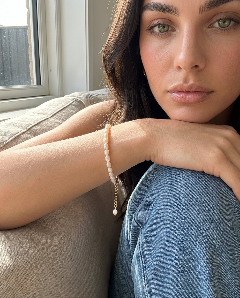 Eira Pearl Bracelet är skapad med äkta sötvattenpärlor som ger varje armband ett unikt uttryck. De oregelbundna formerna gör att det känns levande och personligt, samtidigt som designen håller sig enkel och tidlös.