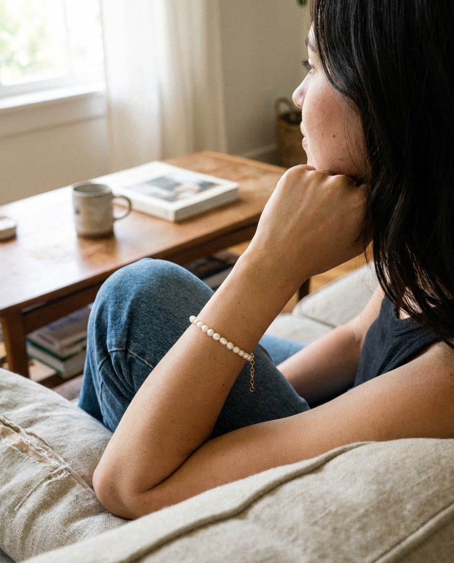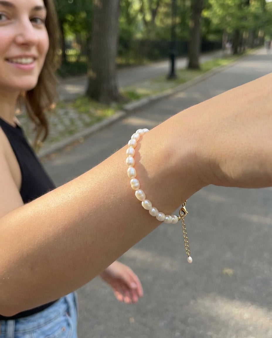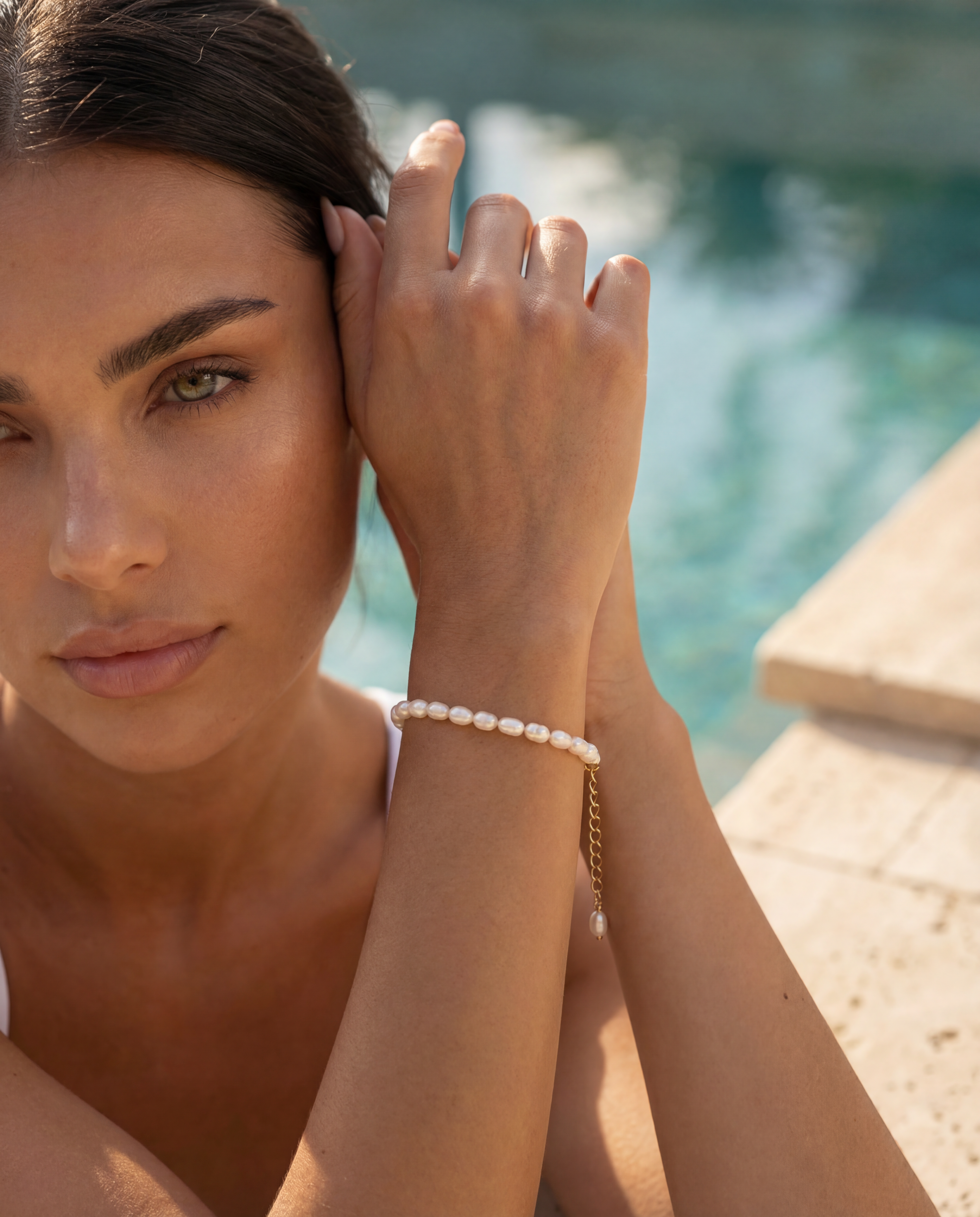 Eira Pearl Bracelet är skapad med äkta sötvattenpärlor som ger varje armband ett unikt uttryck. De oregelbundna formerna gör att det känns levande och personligt, samtidigt som designen håller sig enkel och tidlös.